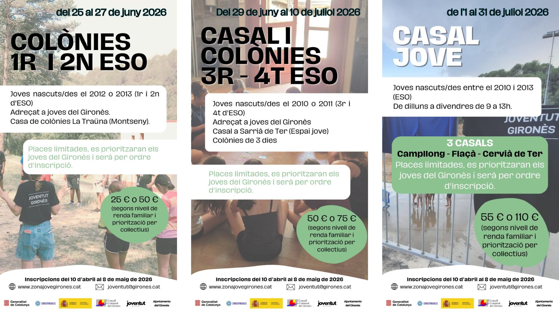 Colònies Gironès (1r i 2n ESO), del 25 al 27 de juny. Inscripcions obertes del 10 d’abril al 8 de maig a www.zonajovegirones.cat o joventut@girones.cat. Casal colònies jove (3r i 4t ESO). Del 29 de juny al 10 de juliol. Inscripcions del 10 d’abril al 8 de maig a www.zonajovegirones.cat o joventut@girones.cat. Casal jove (ESO) […]